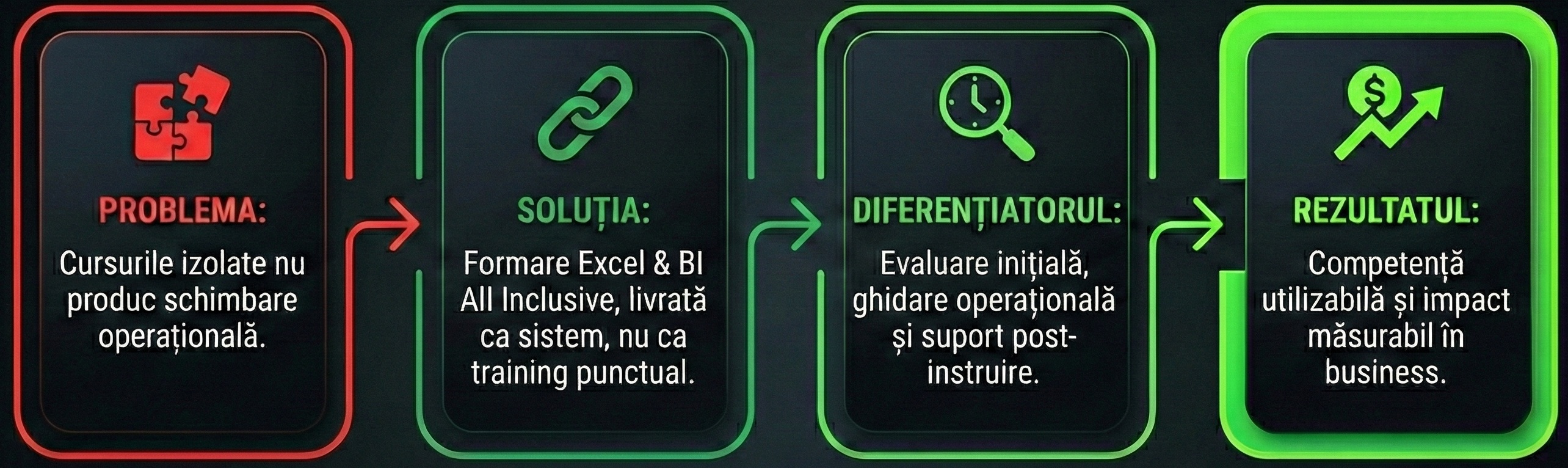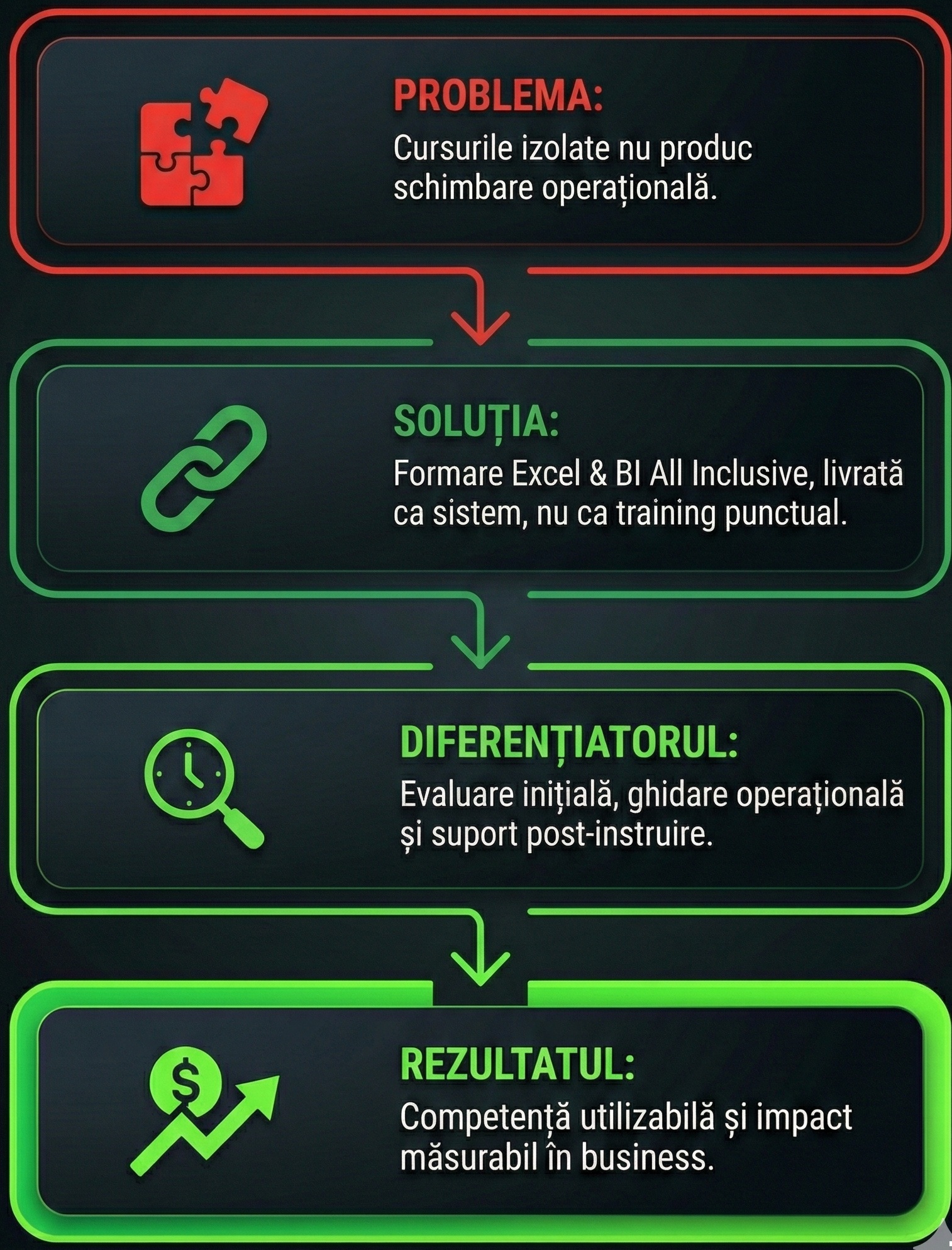 ✓ Programe Excel & BI construite pe procese reale din companii ✓ Adaptate nivelului echipei tale, nu „one-size-fits-all” ✓ Conținut reutilizabil după training, direct în activitatea zilnică